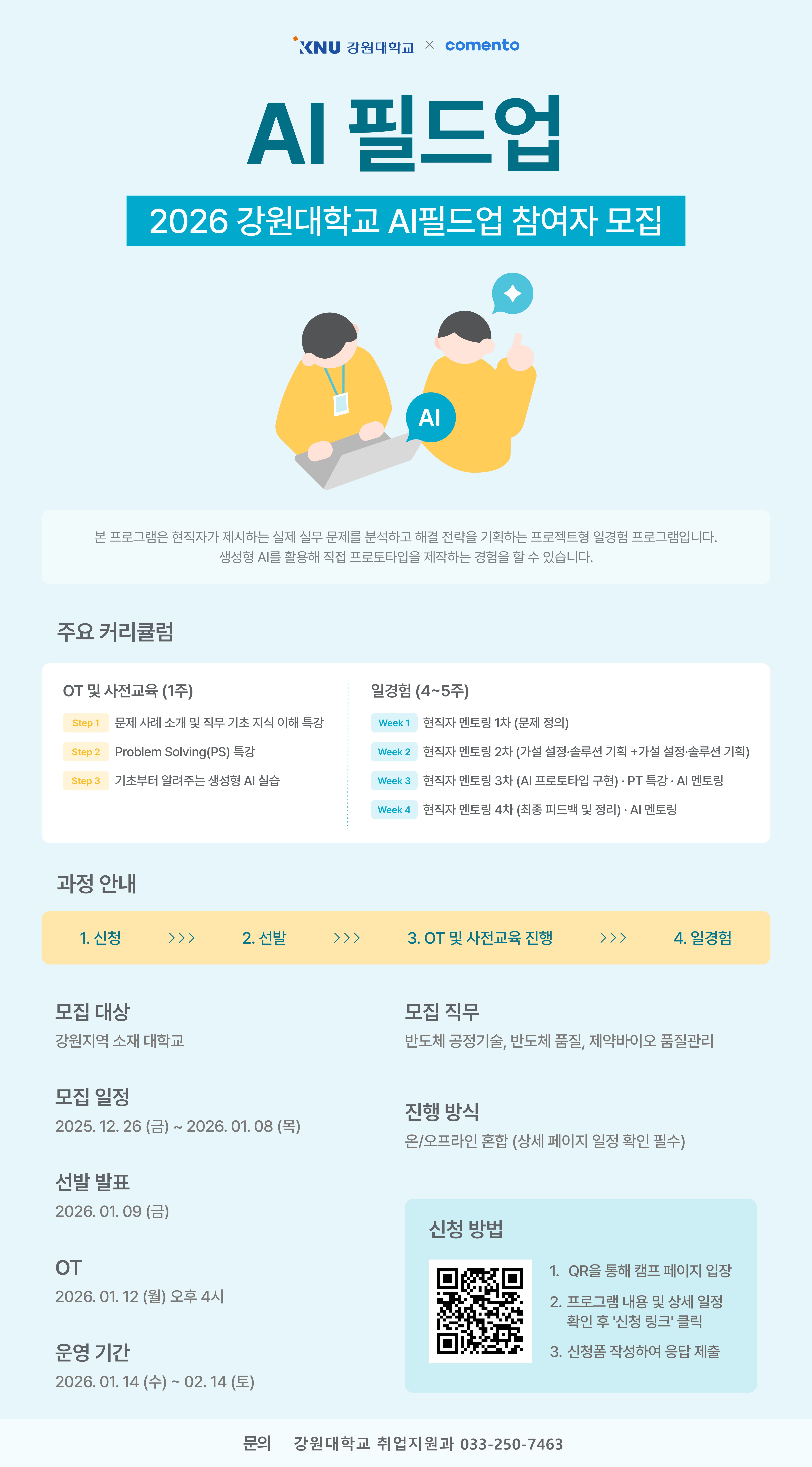 '[KB] IT's Your Life 7기 수강생 모집' 채용공고 안내드립니다. 💥1년에 단 한번만 모집!💥 KB IT's Your Life7기 수강생 2차 모집 중👀(~2/9(월) 09시까지) KB국민은행과 멀티캠퍼스함께 운영하는 'KB국민은행 미래 IT 인재 육성 프로젝트' KB IT's Your Life 7기 수강생을 모집하고 있습니다. KB IT's Your Life는 금융권 IT직무를 희망하는 분들을 위해 "웹서비스 개발을 위한 프론트엔드+백엔드를 모두 아우를 수 있는 풀스택 개발자 교육이 진행"됩니다. 특히 26년도 3월에 개강하는 7기의 경우, AI 활용 역량을 갖춘 풀스택 개발자를 양성하기 위하여, 교육 커리큘럼 내 AI 코드 어시스턴트, 생성형 AI, LLM API를 경함한 프로젝트를 진행하는 등 커리큘럼을 최신화하였으며, 기본적인 훈련장려금 월 30만원 外 KB국민은행은 추가 지원금 125만원이 지급되는 등 교육기간 중 약 300만원 상당의 지원금이 지급됩니다. [KB IT's Your Life 7기 주요 수강혜택] 1. KB국민은행 서류전형 면제(우수 수료생) 2. 약 300만원 상당 지원금 지급(전원, 출석률 기준) 3. KB국민은행 현직자 특강 제공 4. KB 해커톤 경진대회 참여(수상자 상장 및 상금 수여) 5. 2박3일 제주도 연수 지원(종합 실무 프로젝트 우수팀 대상) 이 외에도 다양한 혜택이 제공되고 있사오니, 금융권 취업을 희망하는 대학 재(휴)학생 및 졸업생 분들에게 적극적으로 KB IT's Your Life 7기 수강생 모집 홍보 요청드리고자 합니다. 하기 내용 참고 부탁드리며, 관련 문의 사항은 언제든지 편하게 말씀 부탁드립니다. 감사합니다. [KB IT's Your Life 7기 수강생 모집안내] 1. 모집 기간: 2026.01.20(화) ~ 2026.02.09(월) 09시까지 2. 교육 기간: 2026.03.04(수) ~ 2026.08.26(수), 월~금 총 960시간 3. 교육 내용: AI 활용 역량을 갖춘 금융권 맞춤 풀스택 개발자 양성교육 4. 교육 장소: 대면(멀티캠퍼스 세종대, 서울시 광진구), 비대면 ▼ 교육과정 자세히보기 ▼ https://vo.la/eBLWZKE * 위의 링크 접속이 어려울 경우, 네이버 검색창에 "KB IT's Your Life" 검색 후 상단 웹페이지를 통해 확인부탁드립니다. 채용게시판 등재 요청 자료 구분 내용 공고명 [KB] IT's Your Life 7기 수강생 모집 공고접수기간 2026.01.20 ~ 2026.02.09 09시 공고 URL https://multiit.co.kr/pages/upEaMW251020?mediaCode=site 공고파일첨부 kb it's your life 7기 2차 모집 안내 게시물_pc.jpg kb it's your life 7기 모집 안내포스터_2차.jpg