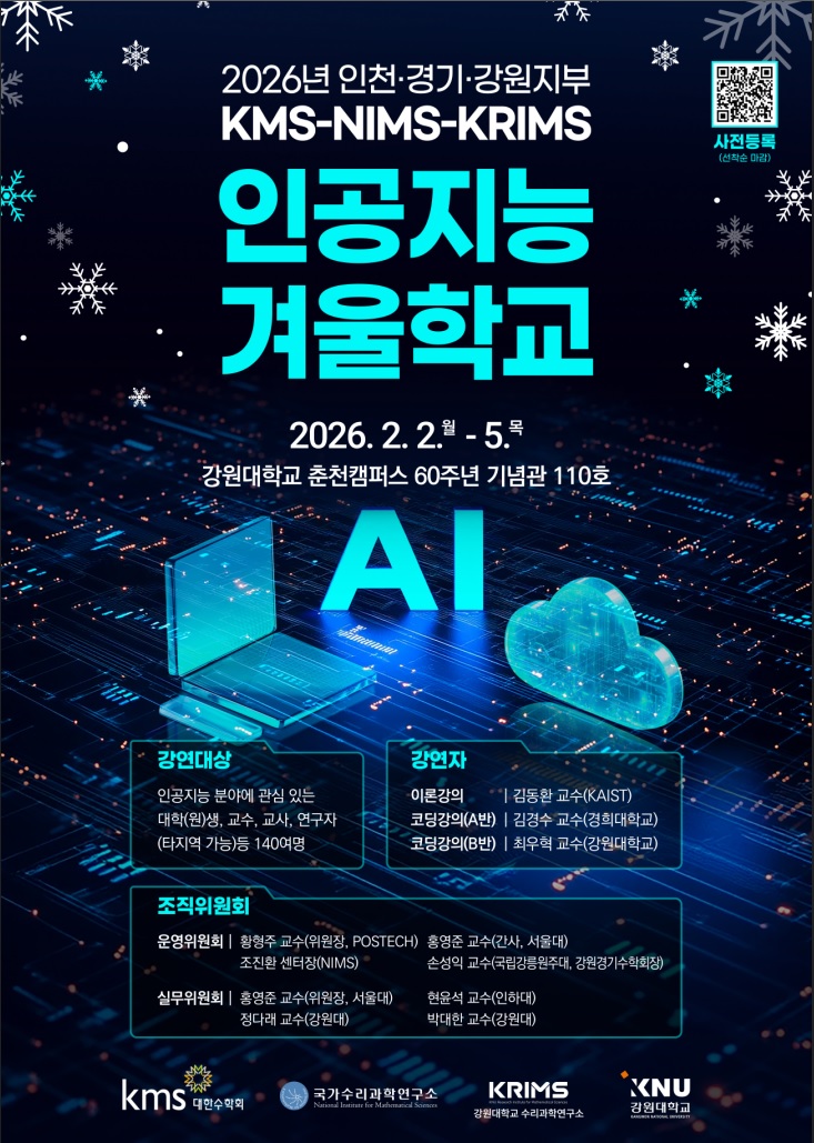 강원대학교 수리과학연구소(KRIMS), 대한수학회(KMS), 국가수리과학연구소(NIMS)는 대학생 및 대학원생을 주요 대상으로 「2026년 인천·경기·강원지부 KMS–NIMS–KRIMS 인공지능 겨울학교」를 다음과 같이 개최합니다. 인공지능 및 수리과학 분야에 관심 있는 학생과 연구자 여러분들의 많은 관심과 적극적인 참여를 부탁드립니다.