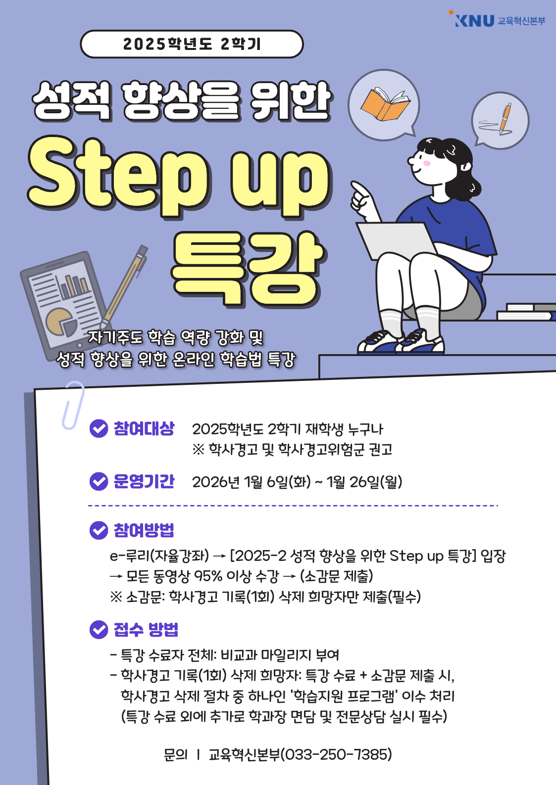 2. 교육혁신본부에서는 학사경고 및 학업부진 학생의 학업 지속과 재학생의 자기주도 학습 역량 강화를 위하여 「2025학년도 2학기 성적 향상을 위한 Step up 특강」을 다음과 같이 시행하오니, 재학생에게 적극 안내하여 주시기 바랍니다.